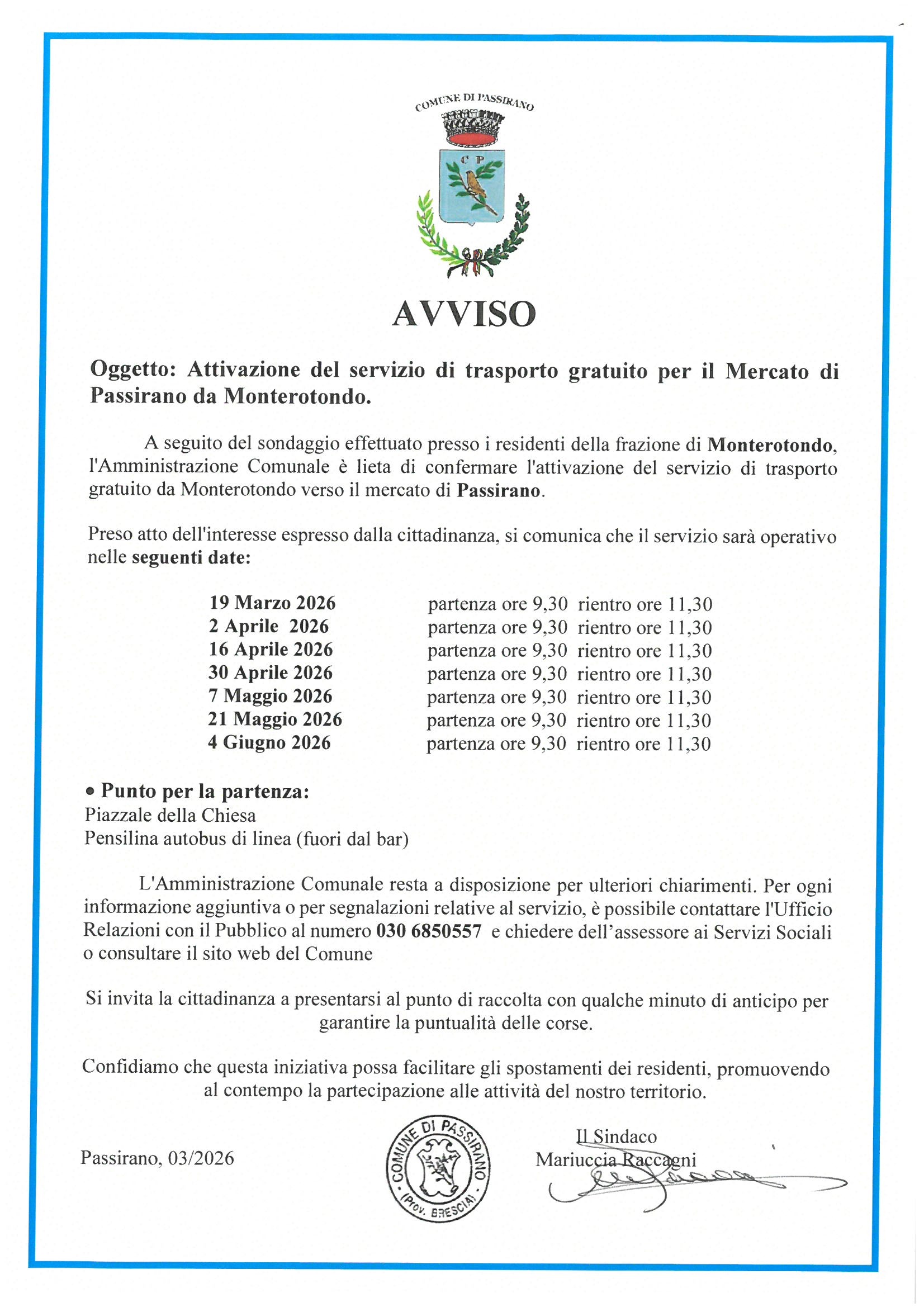 l'Amministrazione comunale è lieta di annunciare l'attivazione di un servizio gratuito di trasporto da Monterotondo verso il Mercato di Passirano a partire da giovedì 19 marzo 2026